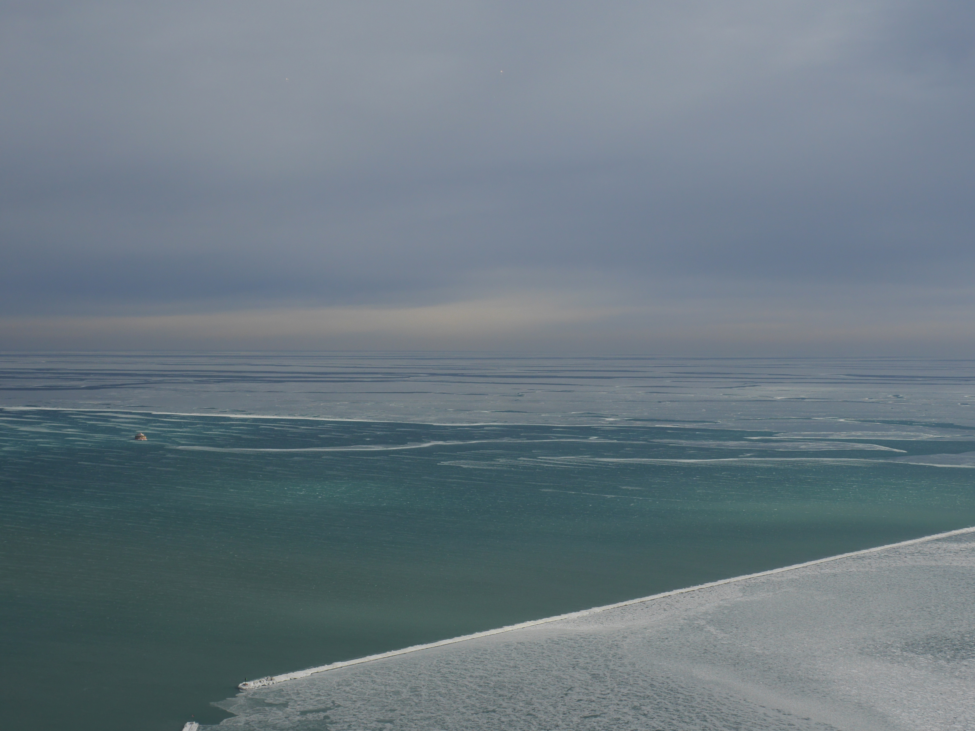 Lake Michigan from atop the John Hancock on January 22. This is one of the most remarkable sights I can remember. To see it in-person is stunning. It seems as if Lake Michigan goes on forever. It seems like this lake right now would define cold water. I hope the fish have sweaters. On second thought, they may be throwing a party. No barbed hooks with irresistible snacks on the end. Here’s to the good fish and damned be the Asian carp. Hail Michigan, not the university, the lake.
